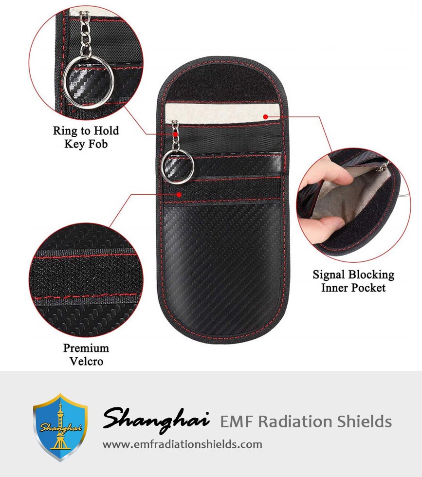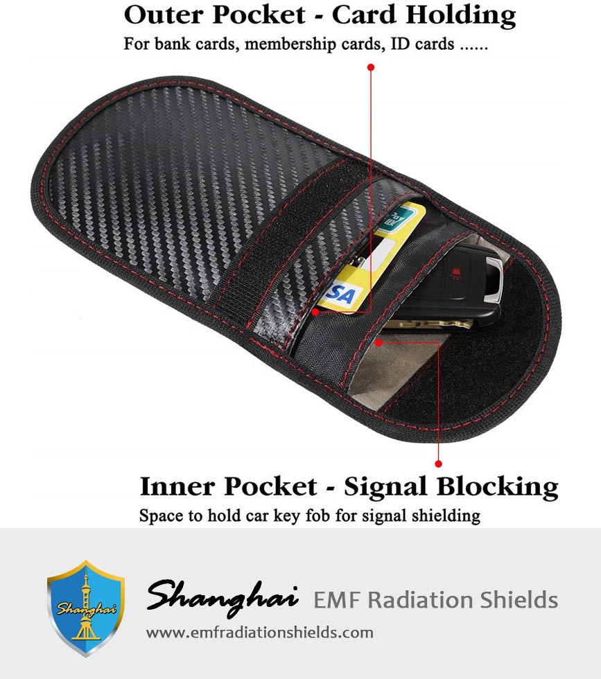 The smaller/front pocket is anti-radiation, best for storing ID card, bank cards, etc. The larger/back pocket is for signal blocking, best for storing car key fobs